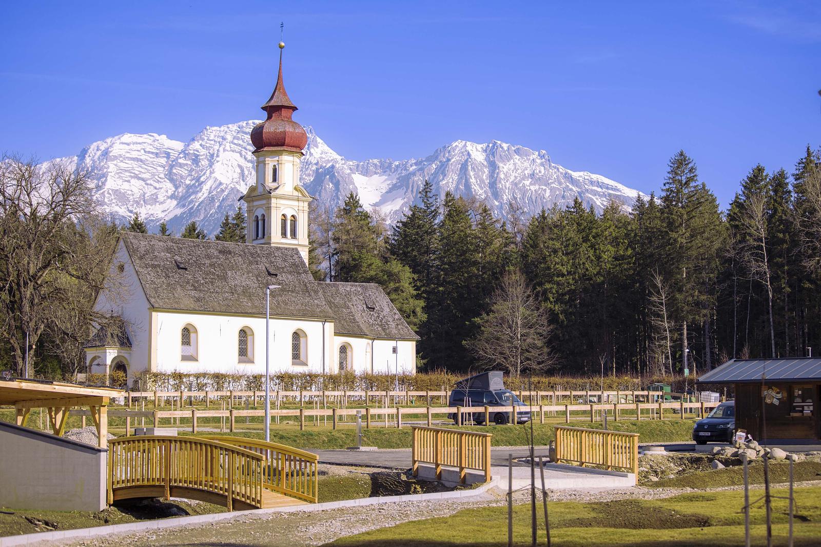 Der Campingplatz Judenstein liegt idyllisch direkt neben einer kleinen Barockkirche aus dem 17. Jhdt. in einem charmanten und geschichtsträchtigen Ortsteil von Rinn, dem gleichnamigen Ortsteil Judenstein.