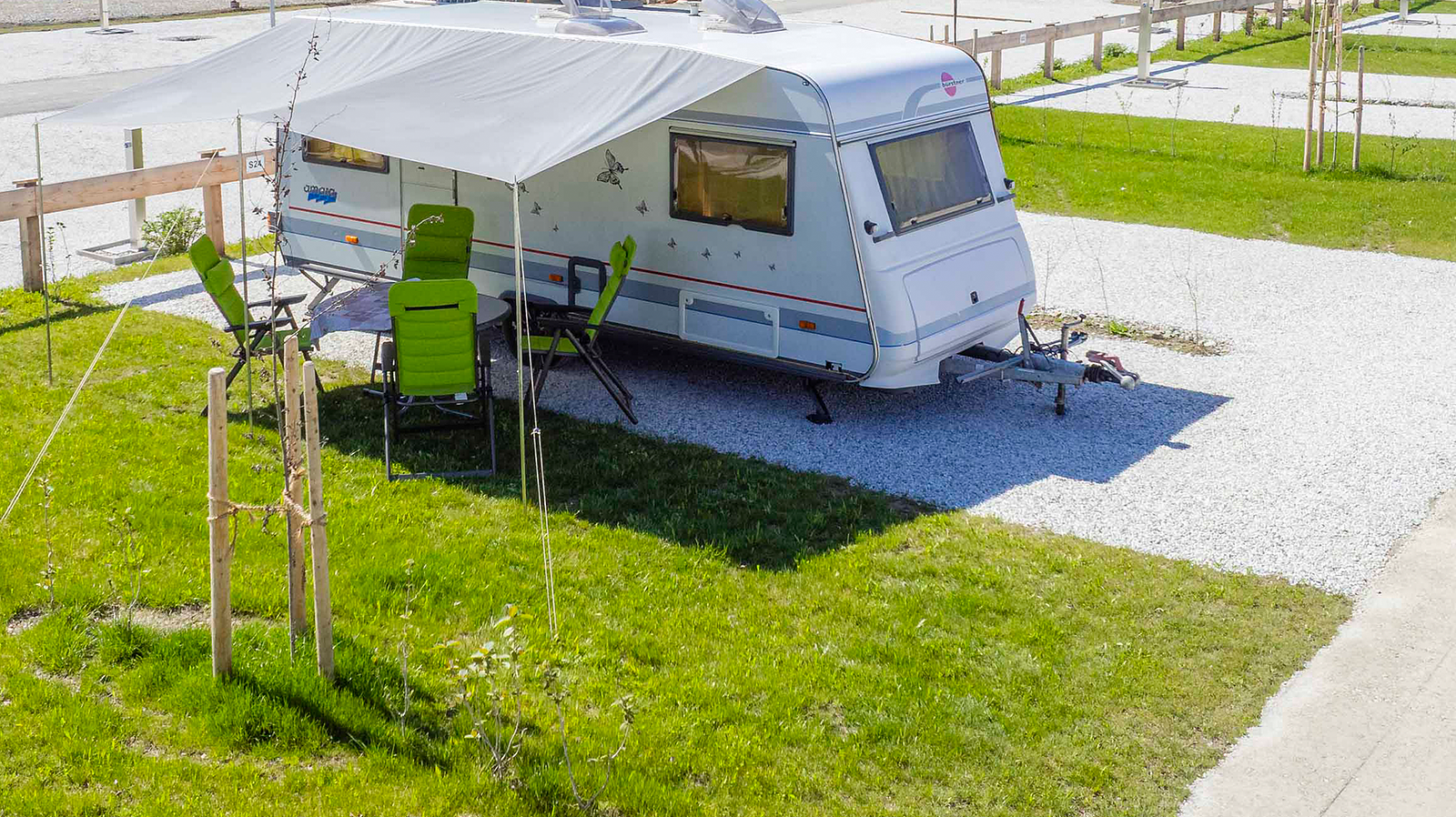 Genießen Sie die Ruhe des Campingplatzes, der von Wiesen und Wäldern umgeben ist.